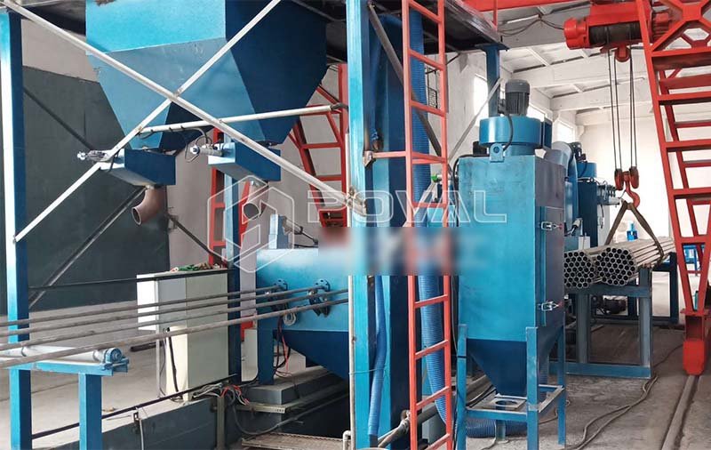 4、小口徑的鋼管使用內(nèi)壁噴丸機(jī),鋼管內(nèi)壁噴丸處理線,主要包括移動臺車,砂斗,噴砂罐,噴槍,噴槍承載車,鋼管承載系統(tǒng),底部彈丸輸送皮帶機(jī),斗提機(jī),維修平臺,分離器,除塵系統(tǒng),支架,氣動系統(tǒng),壓縮空氣系統(tǒng),電控系統(tǒng)。
