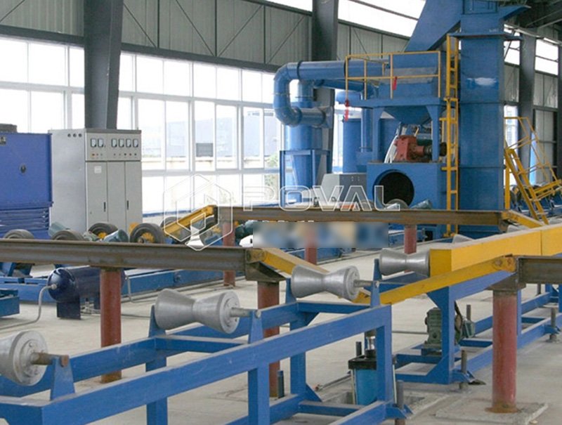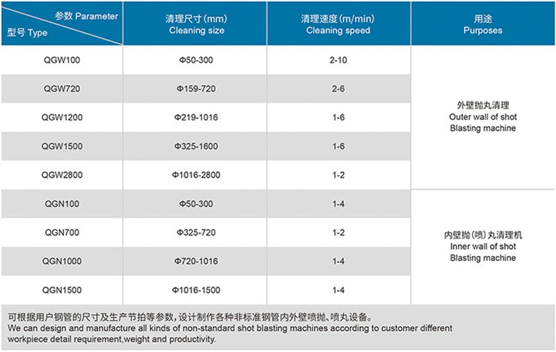 鋼管拋丸清理機(jī)是一種組合清理鋼管內(nèi)外壁的清理機(jī),通過拋丸來清理鋼管的外表面,通過拋噴丸清理內(nèi)表面,使表面的氧化皮均祛除掉。鋼管拋丸清理機(jī)主要利用高效強(qiáng)力拋丸器拋出的高速丸流,拋打位于室體內(nèi)的旋轉(zhuǎn)工件表面與內(nèi)腔上,去掉其它的粘砂、銹層、焊渣、氧化皮及其雜物,使之獲得精細(xì)的光潔表面。提高了漆膜與鋼材表面的附著力,并提高鋼材的抗疲勞強(qiáng)度和抗腐蝕能力,改善了鋼材的內(nèi)在質(zhì)量,延長其使用壽命。